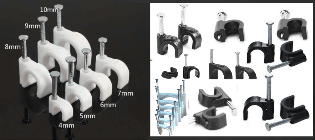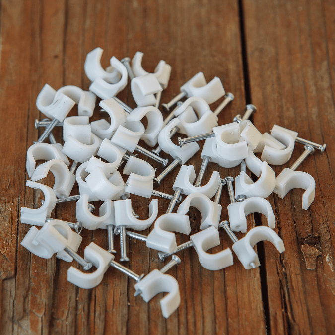 High-quality plastic clips with hardened steel nails for clean and secure cable fixing on walls and ceilings. Easy installation with long-term holding strength.